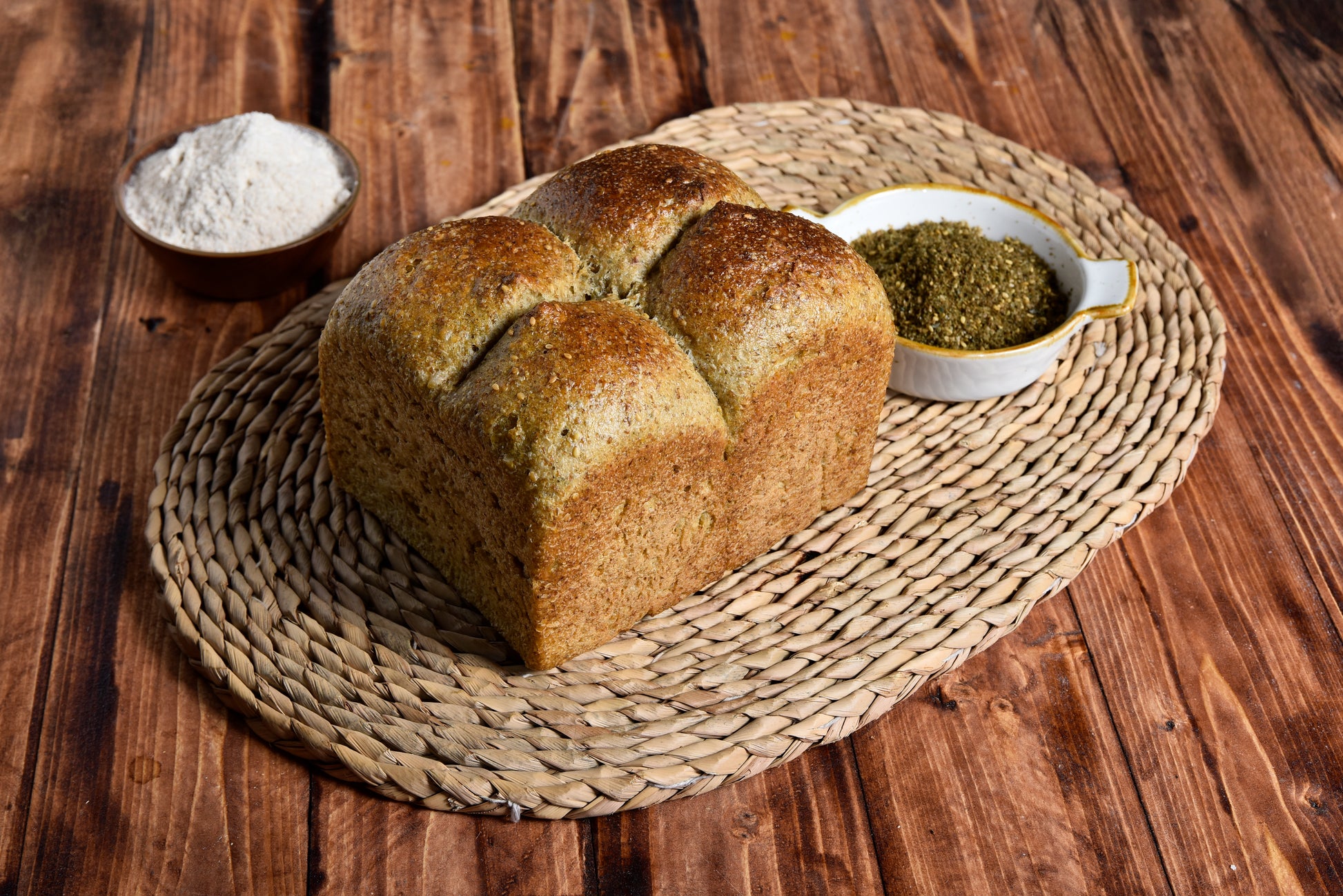 خليط من طحين القمح الكامل مع طحين أبيض عالي البروتين، خميرة خبز الحليب الطبيعية (طحين القمح كامل، سكر القصب البني ، وماء)، حليب كامل الدسم، الزعتر , سكر القصب البني ، زبدة غير مملحة ، ملح البحر، وماء.
