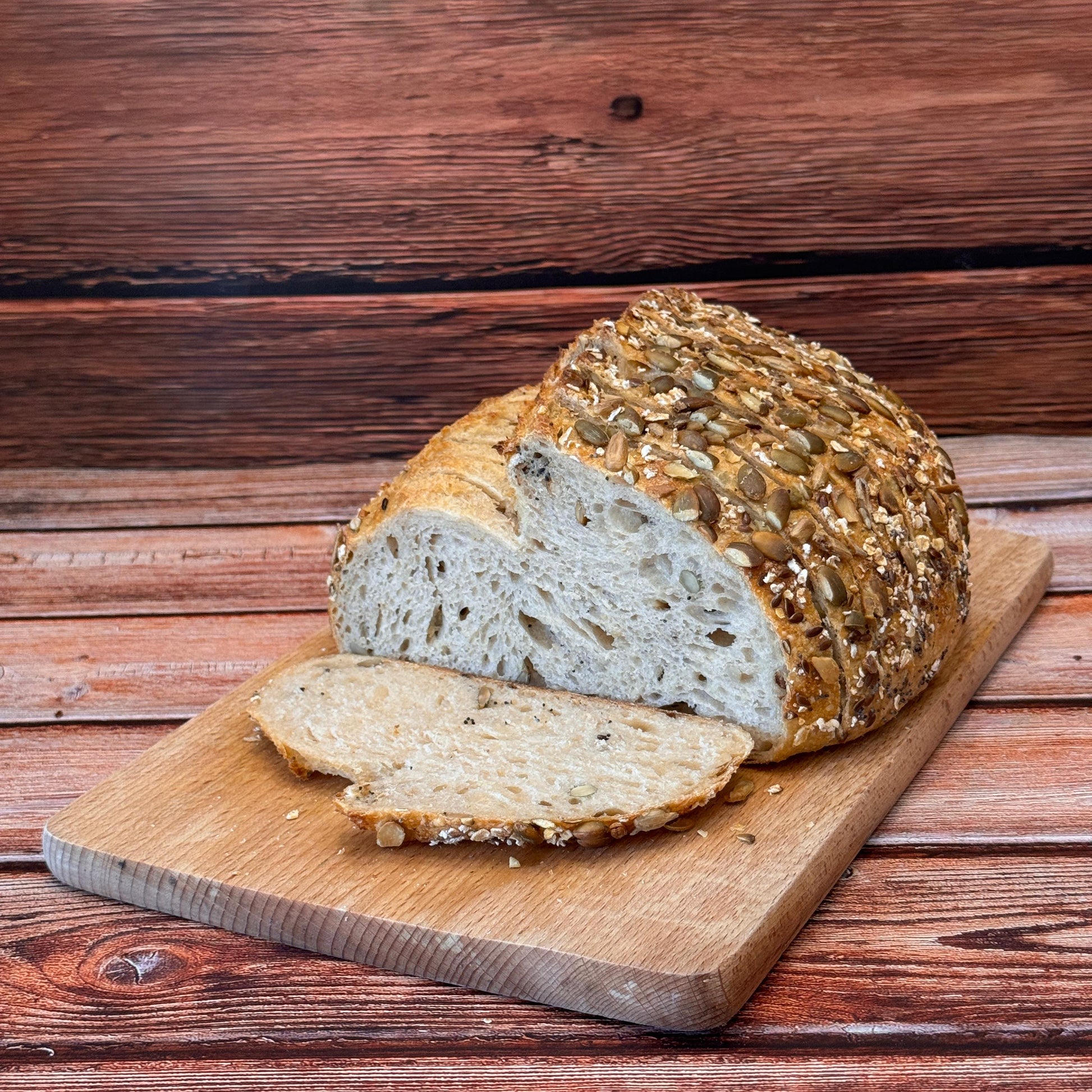 خبز الساوردو متعدد البذور يحتوي على دقيق القمح الكامل والشوفان والبذور المتعددة وزن الرغيف 750 جرام تقريبًا ويقدم مقطعًا شرايح