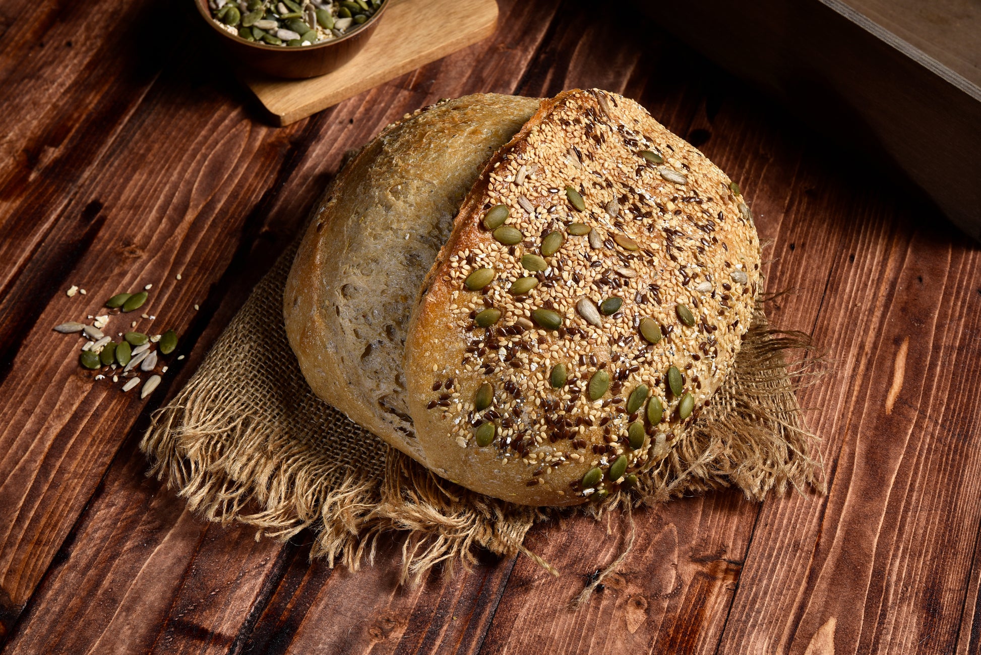 خليط من طحين القمح الكامل مع طحين أبيض عالي البروتين، وخميرة طبيعية (طحين القمح الكامل والماء)، والشوفان، وبذور اليقطين، وبذور دوار الشمس، وبذور السمسم، وبذور الكتان، وملح البحر والماء